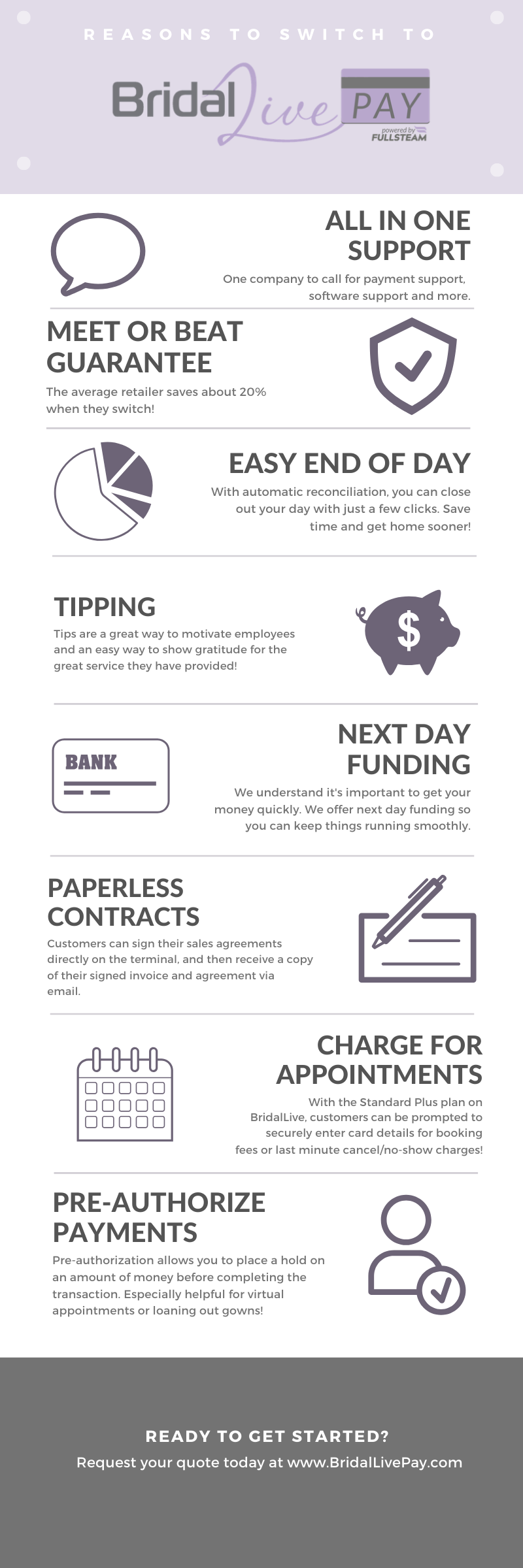 Painless Payments, same great support! BridalLive Pay is fully integrated into your favorite bridal shop software.